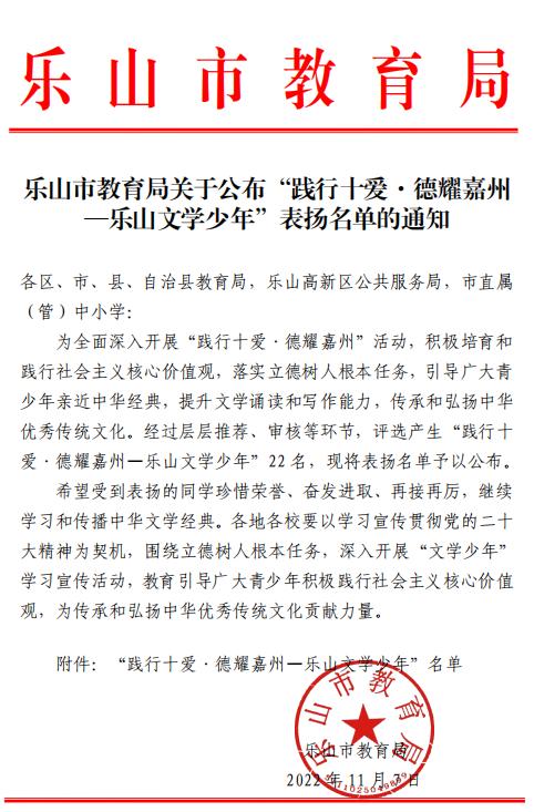 热烈祝贺我校2023届幼师4班赵莺如同学被评为“践行十爱.德耀嘉州——乐山文学少年”!